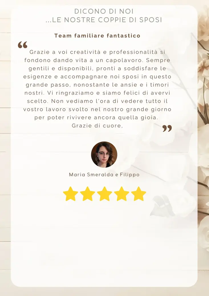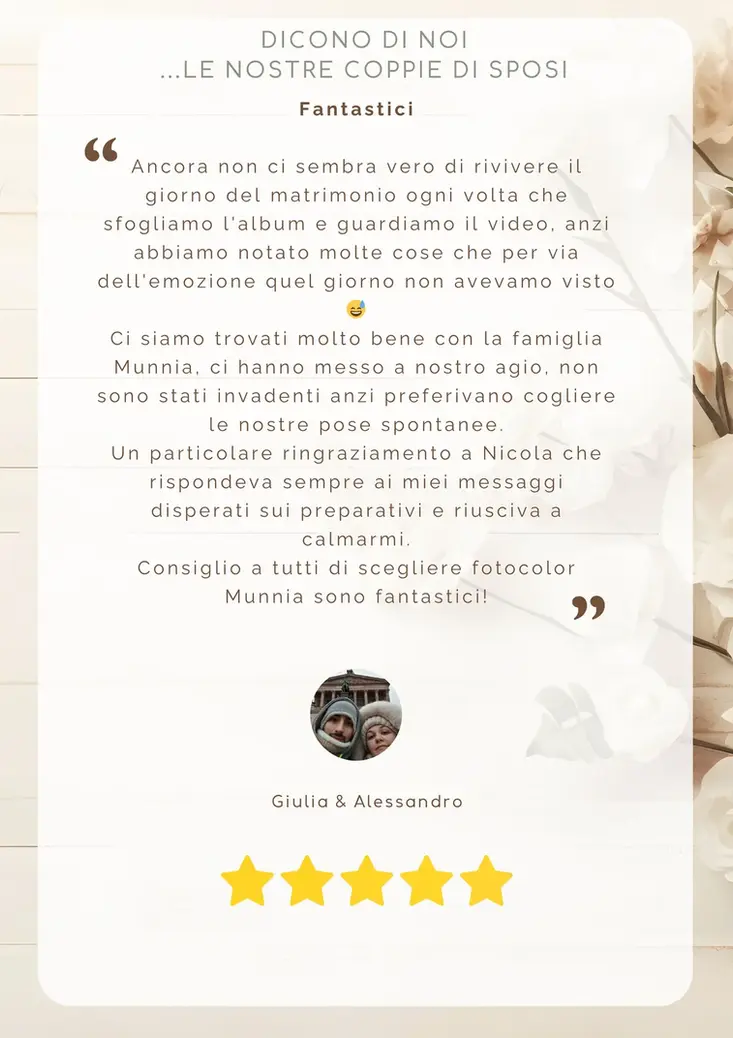 “Professionali, puntuali e sempre disponibili. Ogni dettaglio è stato raccontato con delicatezza. Grazie di cuore!” – Valeria & Marco