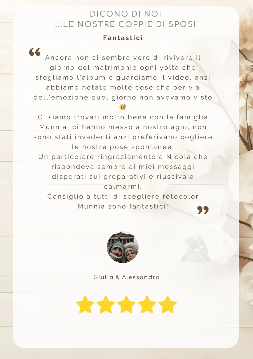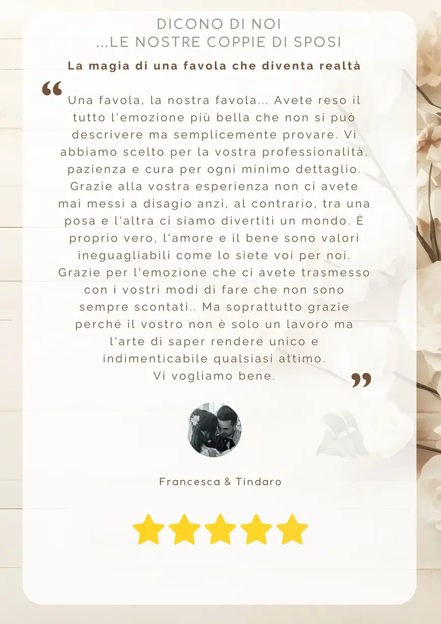 ⭐️⭐️⭐️⭐️⭐️ “Professionali, puntuali e sempre disponibili. Ogni dettaglio è stato raccontato con delicatezza. Grazie di cuore!” – Valeria & Marco